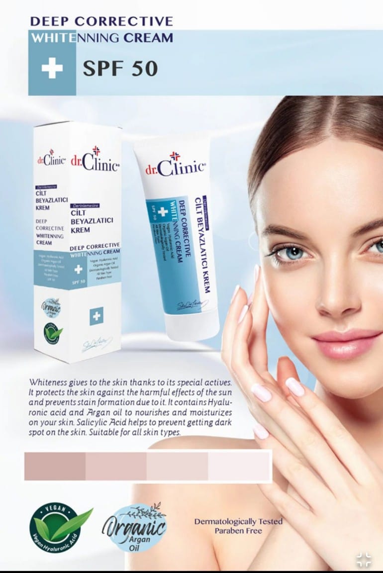 Dr. Clinic ব্র্যান্ডের একটি স্কিন কেয়ার প্রোডাক্ট, যার নাম Deep Corrective Whitening Cream। এটি মূলত ত্বকের উজ্জ্বলতা বৃদ্ধি এবং দাগছোপ দূর করার জন্য তৈরি করা একটি তুর্কি (Turkish) কসমেটিক পণ্য।